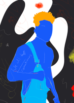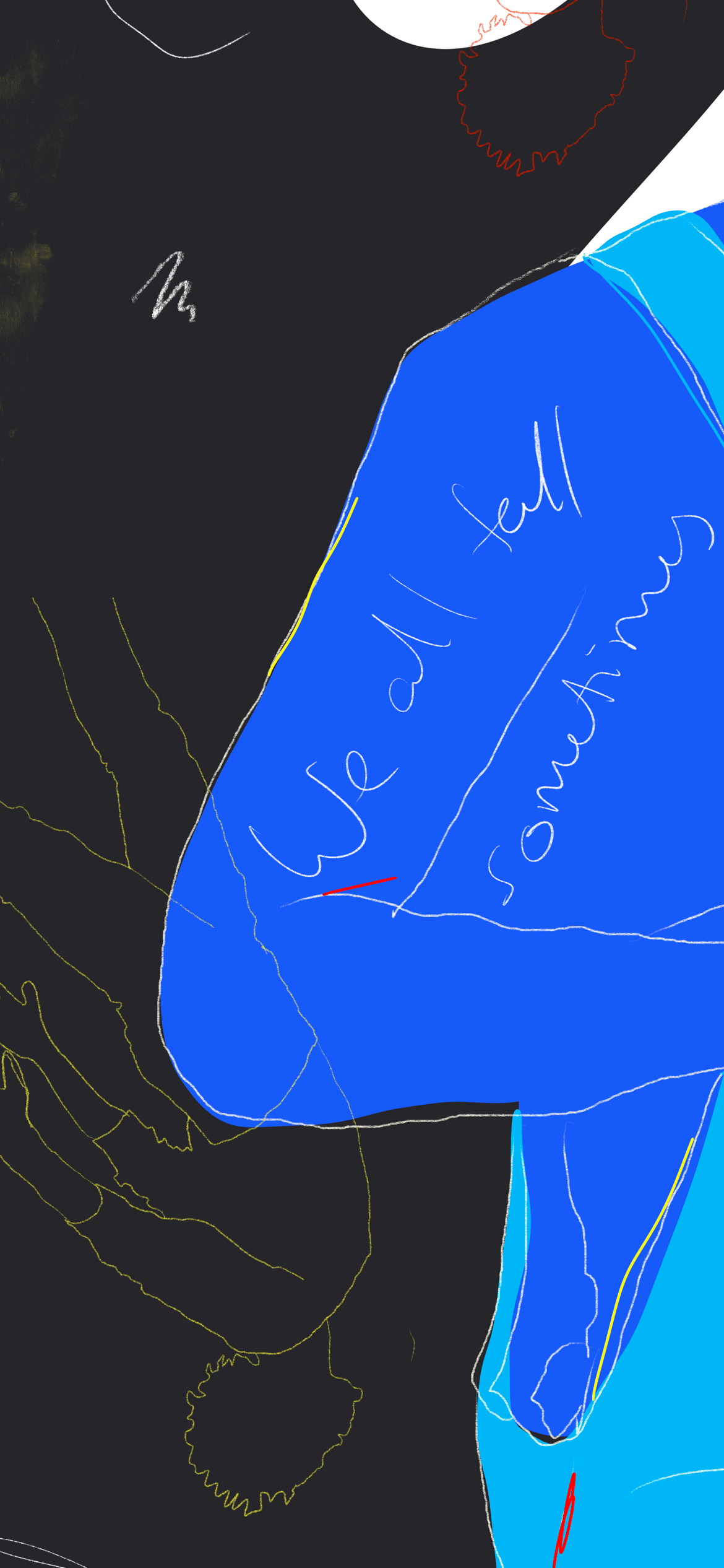 A central figure stands suspended between motion and stillness, while silhouettes on both sides fall endlessly. They mirror the inner conflict between collapse and recovery. At the core, a quiet strength holds the figure upright — a fragile but persistent force that resists the pull downward. The piece captures the tension between falling and rising, revealing resilience as a constant, internal struggle.